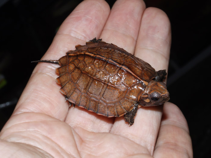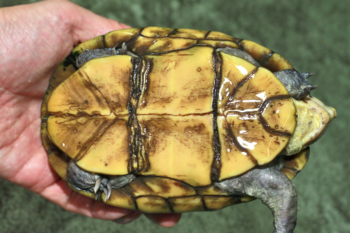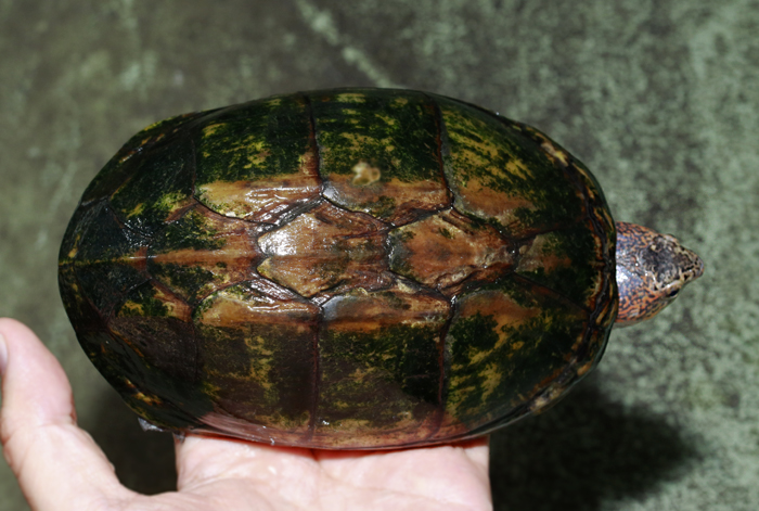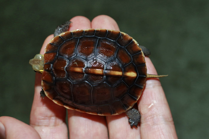 Terrapen carolina triunguis | 国内CB 血統や個体差によってアメリカハコガメの中でも相当なバリエーションがあるミツユビ。最も入手し易いながら、最も奥が深いと言っても過言ではないでしょう。 模様の傾向はまだ不明な現段階から地色の濃淡や柄の素も個体により様々で、どのような方向に育っていくか楽しみ! これは既にくっきりとした花火柄が多数出ている有望な個体です。 指で輪を作ったくらいのしっかりサイズ幼体。 性別不明 腰部 背甲 腹甲 |